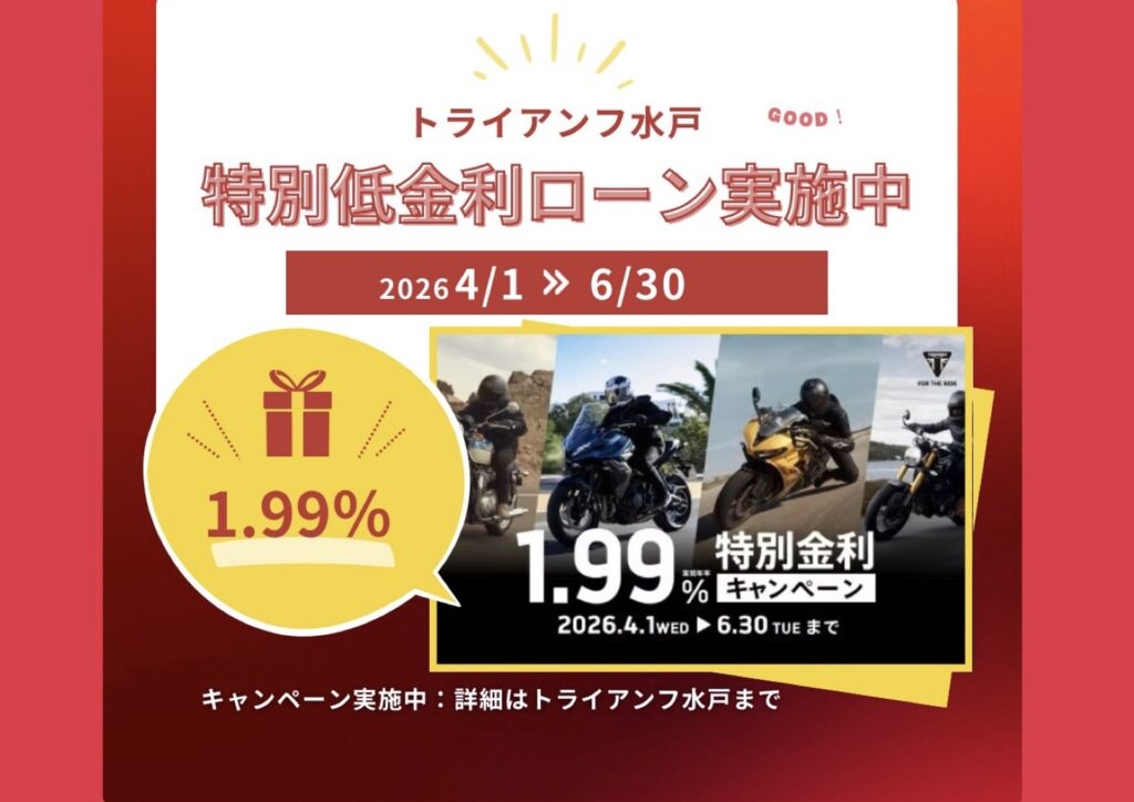 バイクを購入検討中の皆様に朗報です トライアンフ水戸キャンペーン特別低金利ローンのご案内です♬ 通常3.99%のところ!! 乗り換えのチャンス。今だけ、1.99%特別金利…