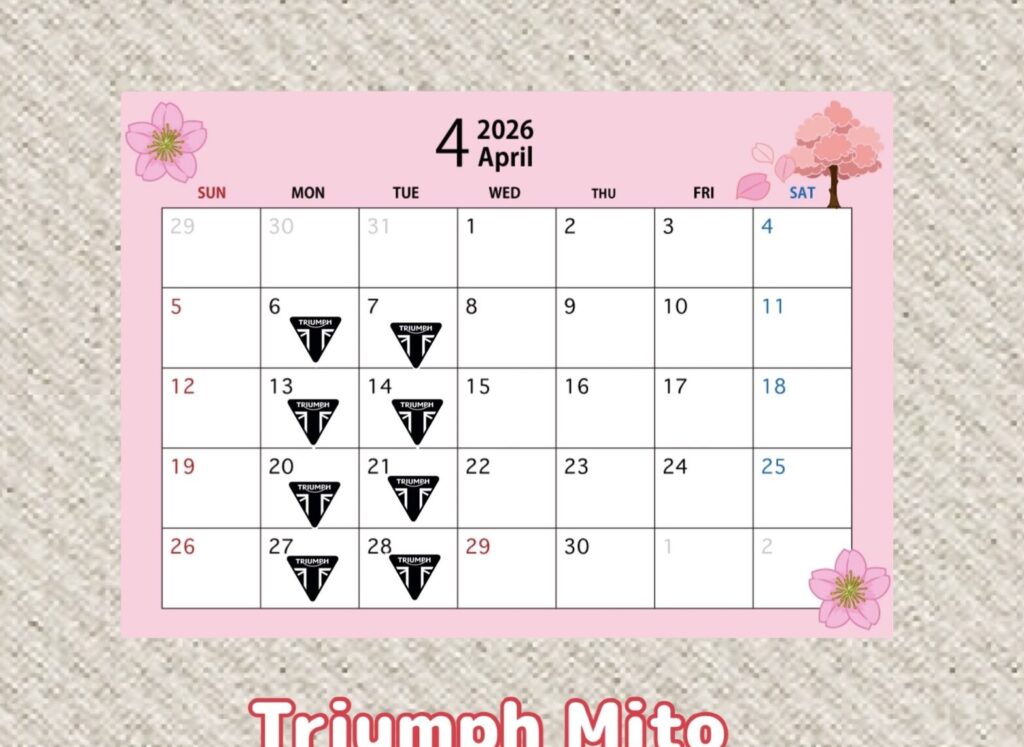 平素は格別のお引き立てを賜わり厚く御礼申し上げます。 2026年4月営業日のお知らせのおしらせです! 営業時間(10:00~18:00) (カレンダー内、トライアンフマークは定休日です)…