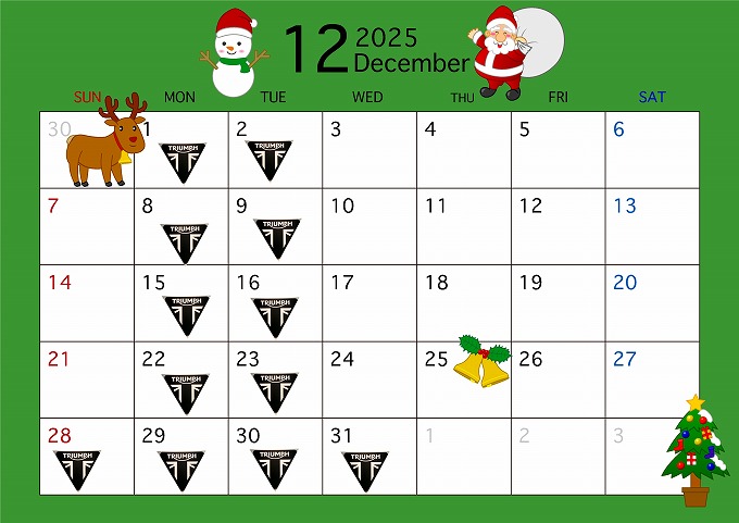 12月定休日…月曜日・火曜日(▼トライアンフマークは休)