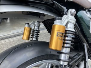 リアサスペンション ツイン オーリンズ製RSU、別体リザーバー、プリロード調整可能、コンプレッション&リバウンドダンピング. ホイールトラベル123mm